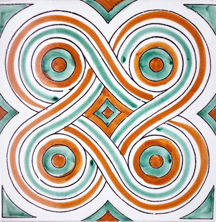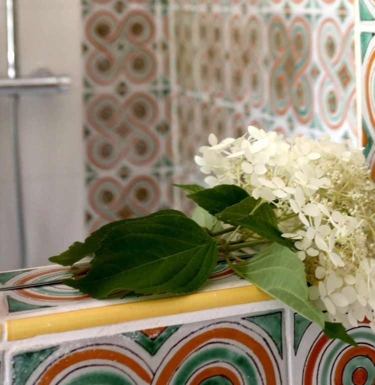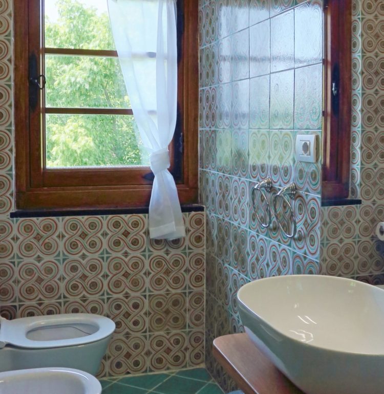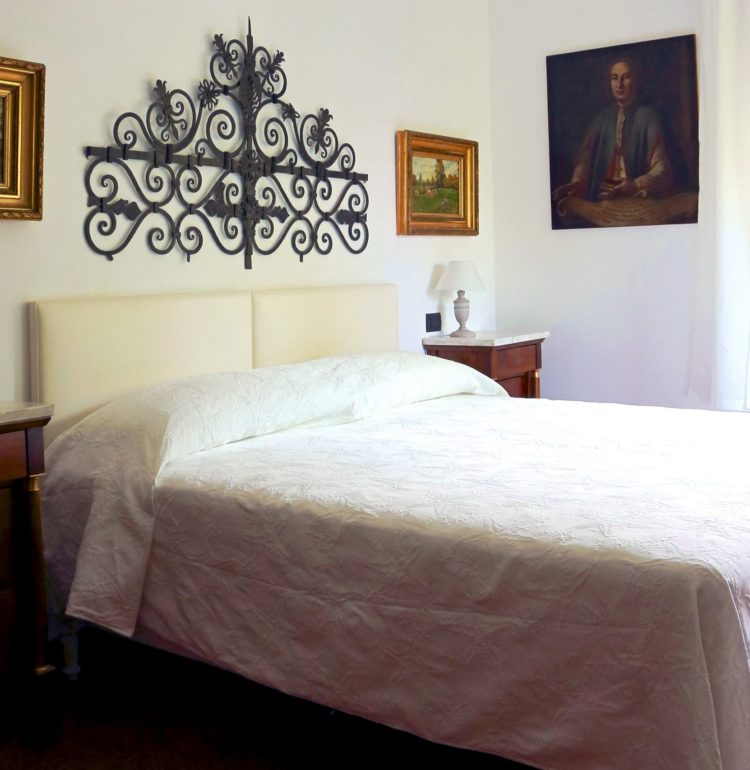 L’antica testiera di ferro battuto è cinta da due piccoli dipinti di paesaggi agresti: le storie di famiglia le attribuiscono alla Bisnonna Amalita, mamma di Gegi, per la quale fu costruita Villa Bombrini.