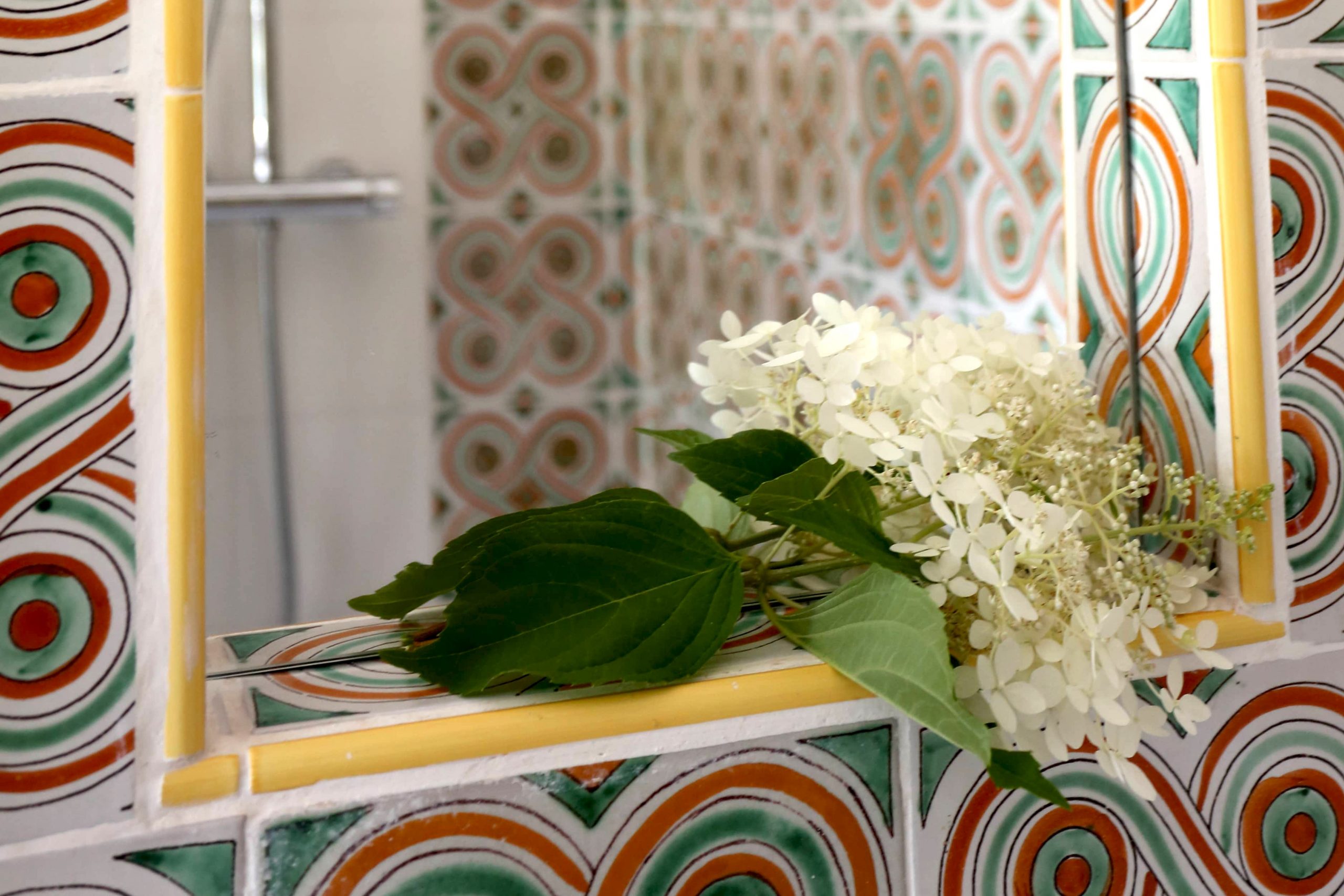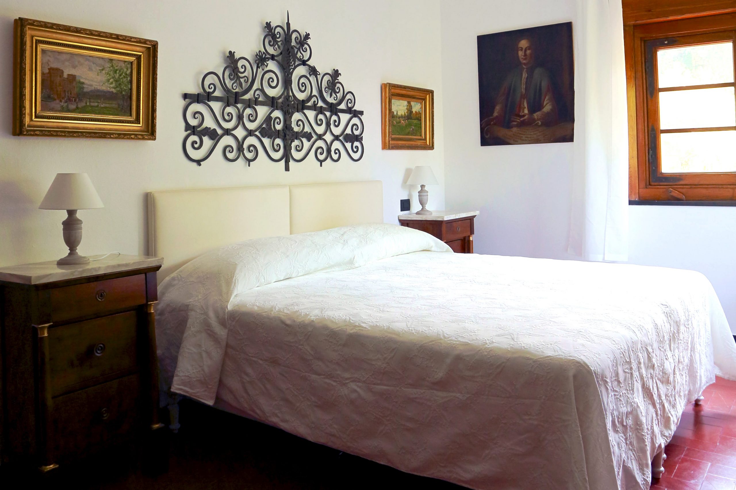 L’antica testiera di ferro battuto è cinta da due piccoli dipinti di paesaggi agresti: le storie di famiglia le attribuiscono alla Bisnonna Amalita, mamma di Gegi, per la quale fu costruita Villa Bombrini.